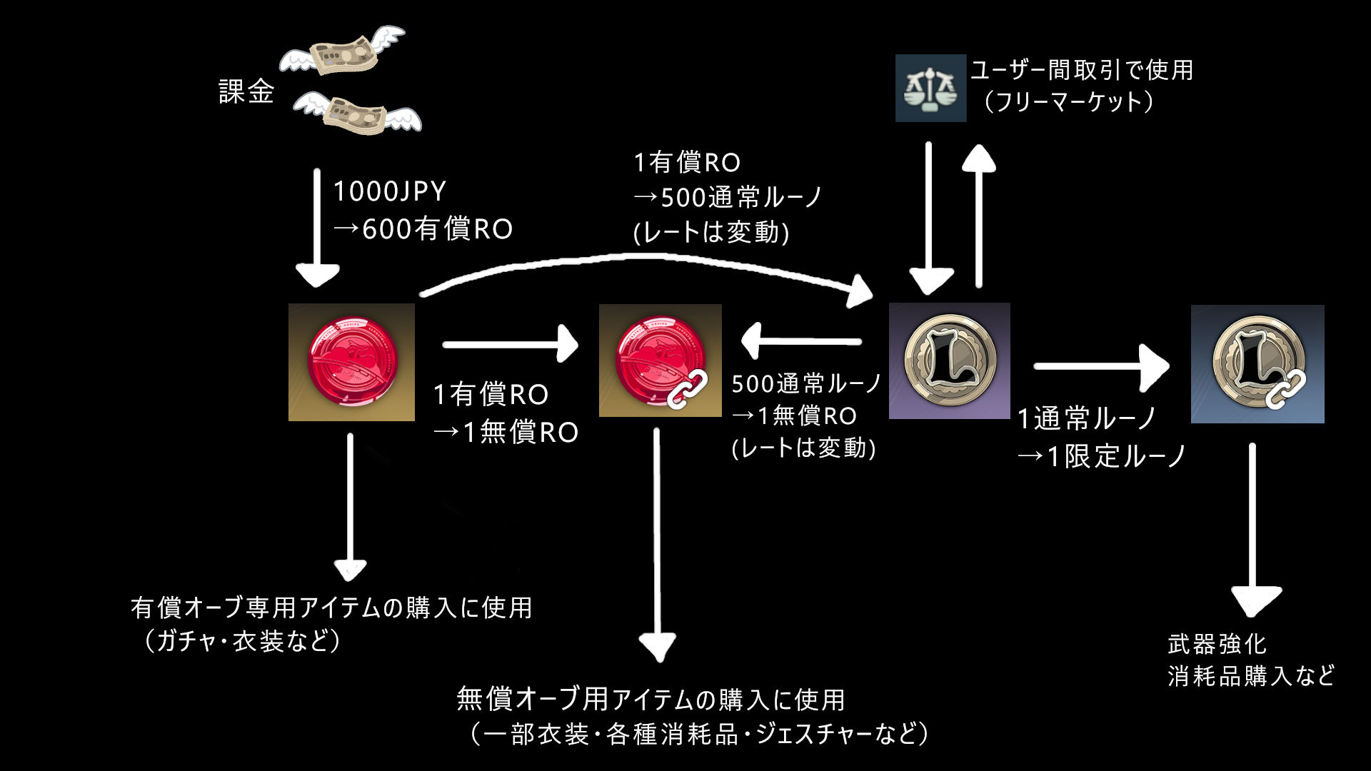 各種通貨はそれぞれ交換手段があり、システムまたはユーザー間取引で別の通貨への交換することができる。
